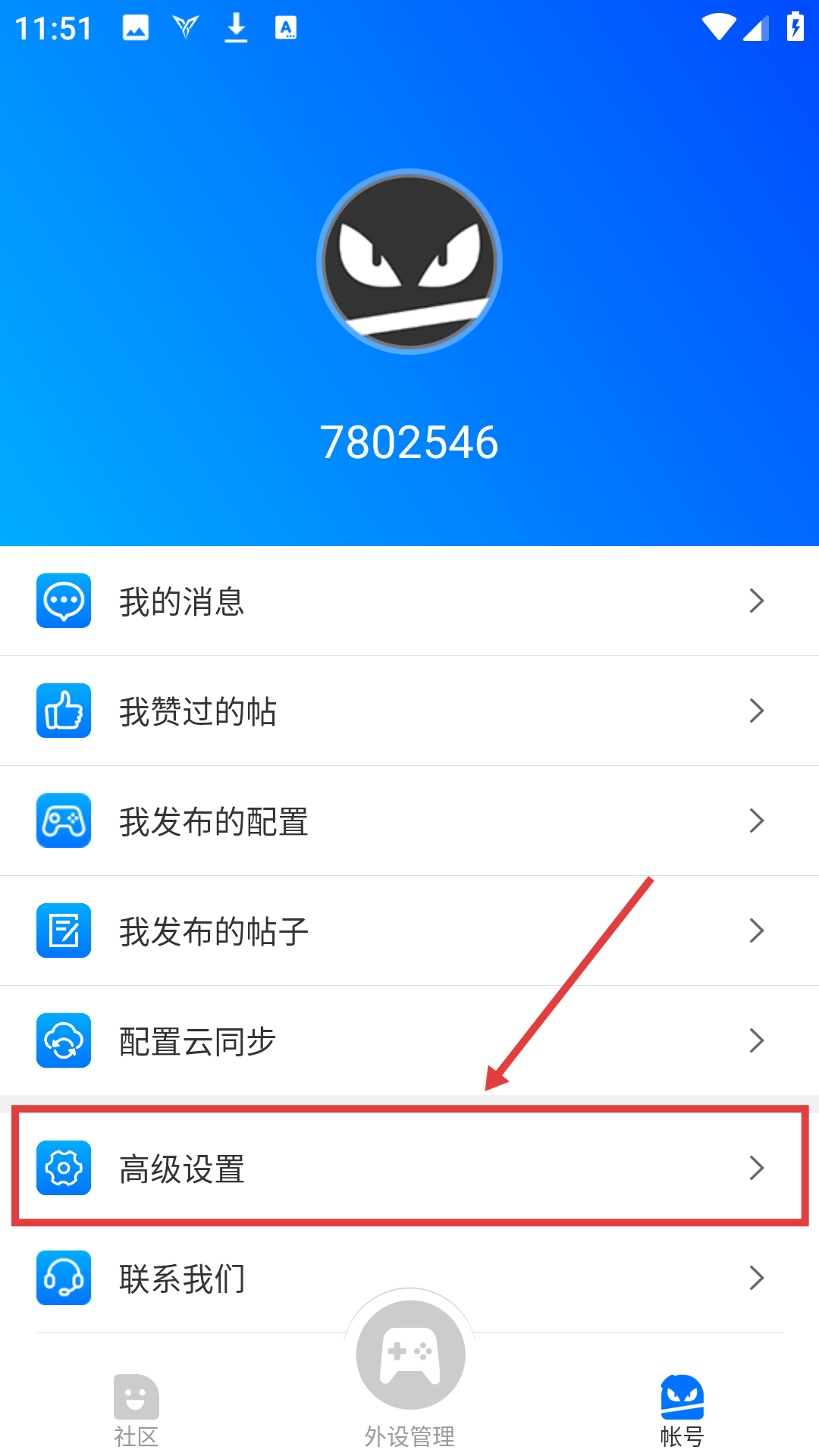 2、在账号页面,点【高级设置】,能进入高级设置页调整功能选项啦。