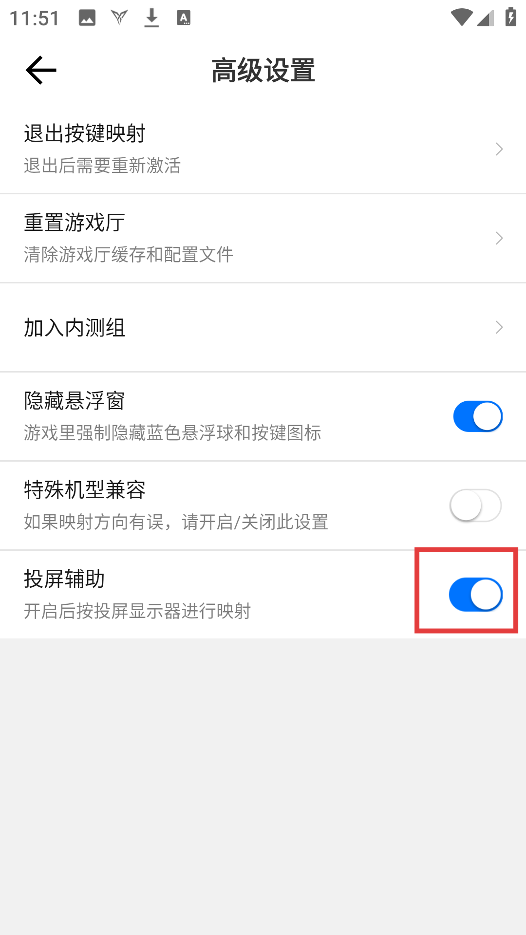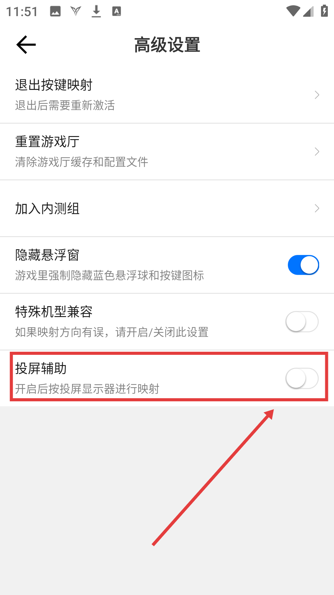 3、在高级设置里,找到【投屏辅助】开关,可对投屏辅助功能进行设置呢。