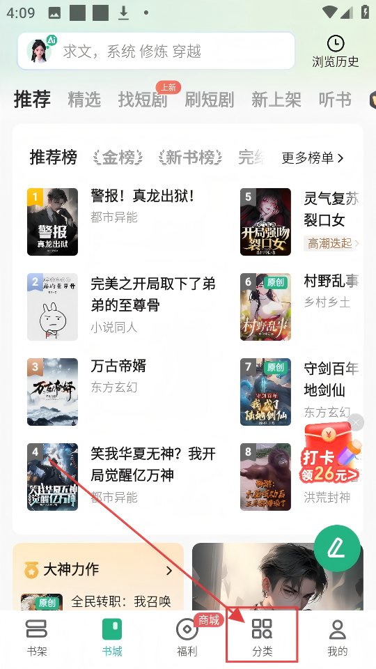 1、在书城页面,点击底部【分类】,就能进入小说分类页面,超多类型任你选。