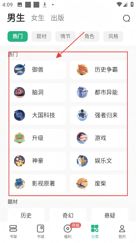 2、在分类页面,能看到各类小说题材标签,找到喜欢的题材,点击它就能筛选出对应小说。