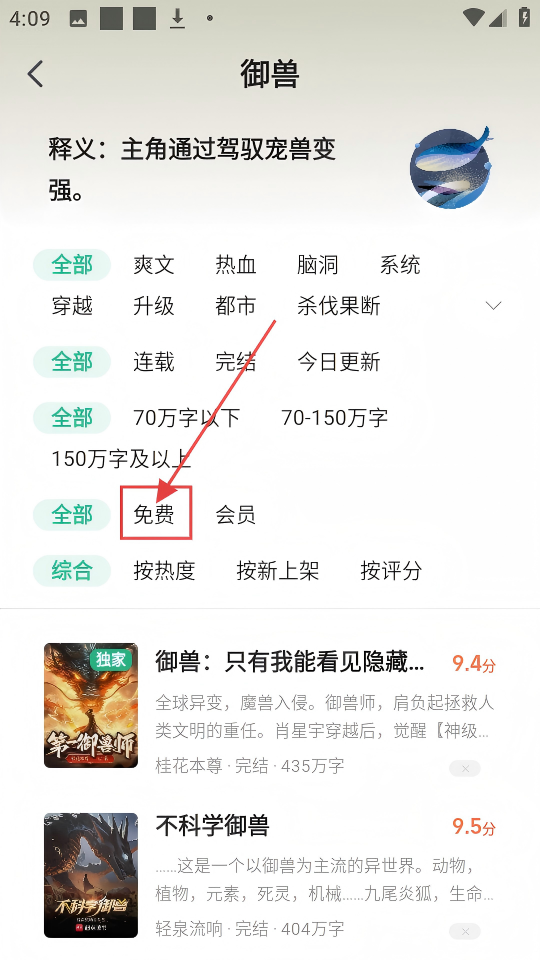 3、进入题材筛选页面后,找到【免费】标签并点击,就能筛选出免费的小说啦。