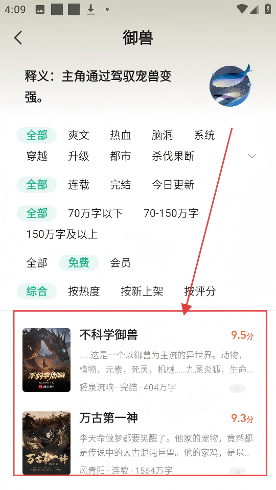 4、筛选后,会展示出免费的小说列表,找到心仪小说,点击它就能开始阅读啦。
