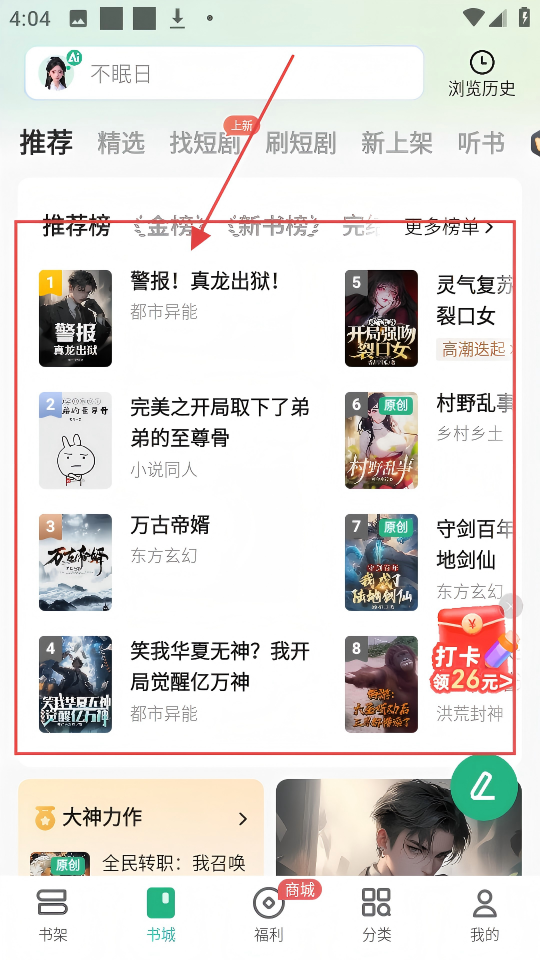 1、在书城页面,能看到各类推荐榜单,找到心仪小说,点击它就能进入阅读页面啦。