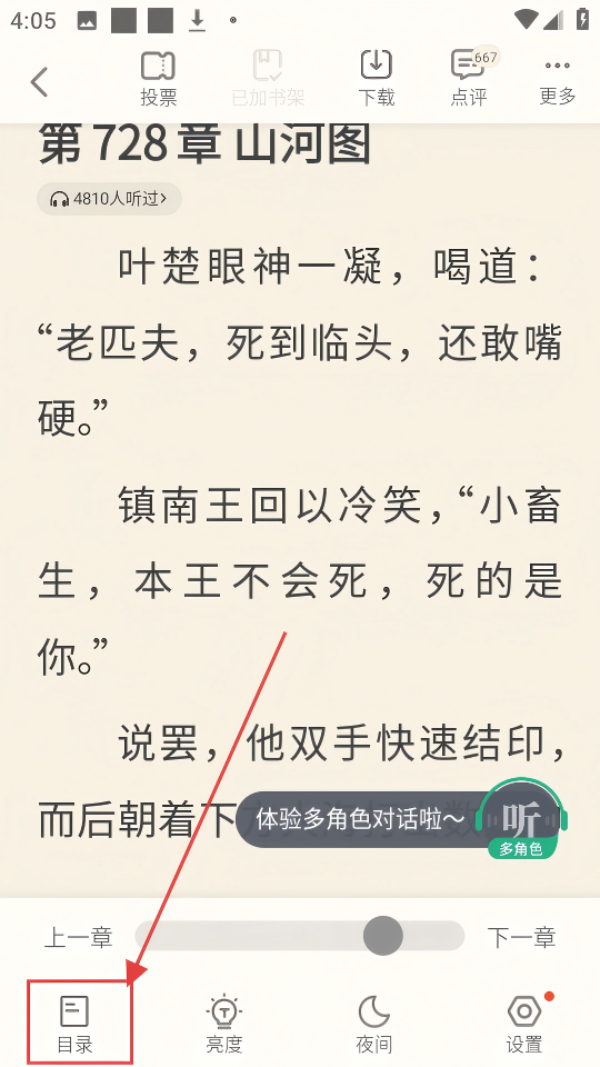 2、在小说阅读页面,点击底部【目录】,就能打开小说目录,超方便查找章节。