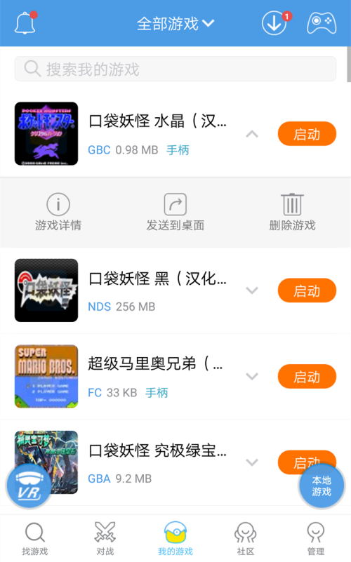 3、下载成功后,触摸下方中部的【我的游戏】即可进入已有游戏管理页面,在此处,触摸游戏名字可弹出如下第二图的窗口,这里可选择查看游戏详情、发送到桌面以及删除游戏。而直接触摸名字右侧的【启动】图标即可进入游戏。