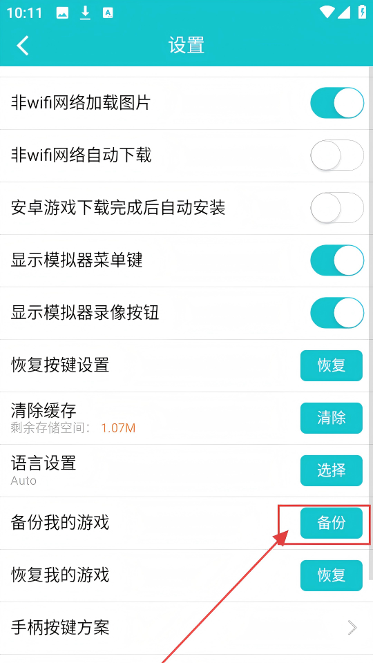 3、设置页面中,找到【备份我的游戏】,点击旁边【备份】,能备份游戏数据。