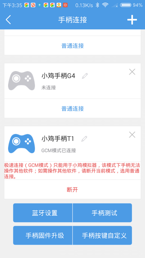 3、由于极速模式也就是GCM模式下连接的手柄只能在小鸡模拟器中使用,如果需要在其他软件中使用则需要使用普通连接。