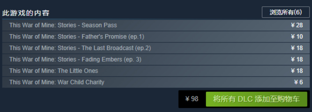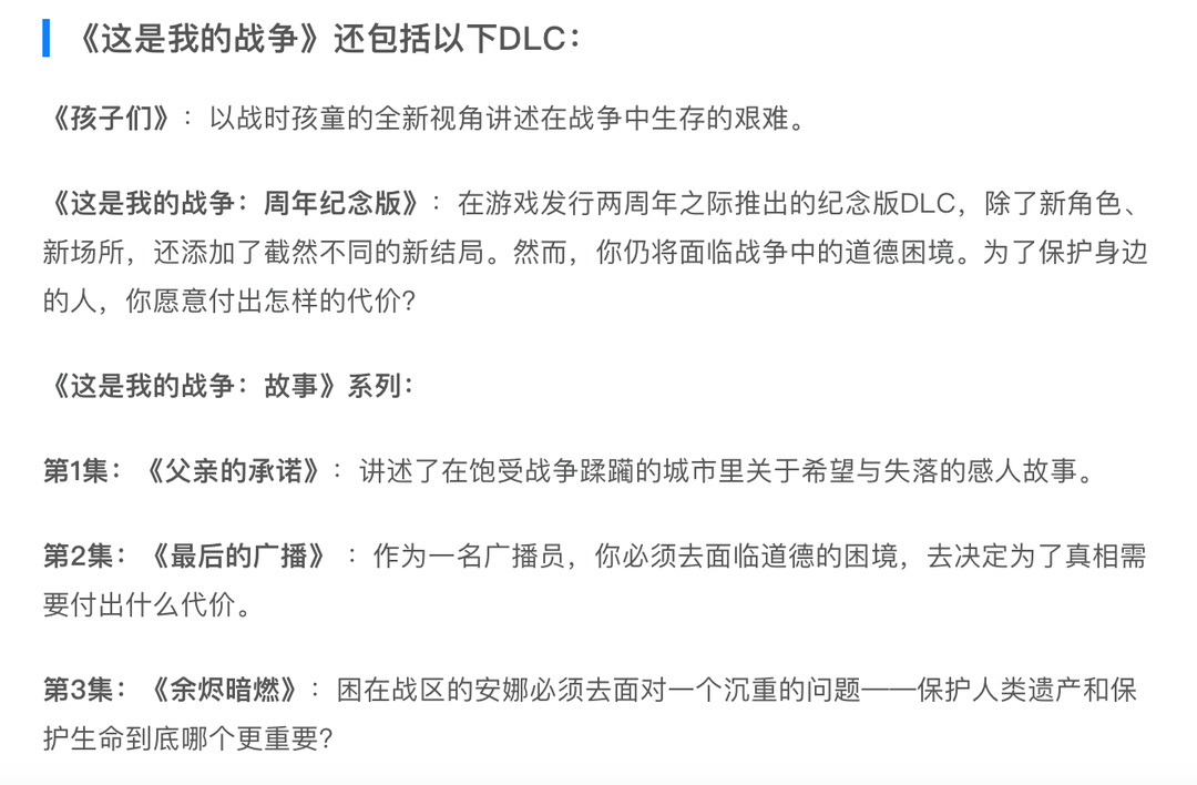 2、这三个DLC系列分别是:孩子们、周年纪念版、故事系列,其中故事系列包含了父亲的承诺、最后的广播、余烬暗燃三个故事。游戏的DLC部分能够让故事情节更为饱满和生动,还是比较值得购入的。