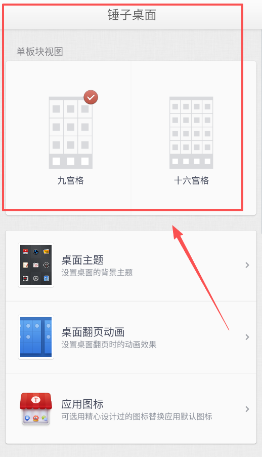 1、首先调整桌面图标布局,进入桌面设置,选择单板块视图,你可以在九宫格和十六宫格之间切换,布局更紧凑或更宽松完全看你的喜好。