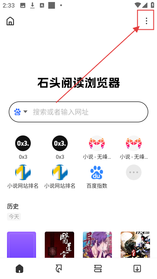 1、在石头阅读浏览器首页,点击右上角三点图标,可进入设置页面,准备调整阅读相关设置啦。