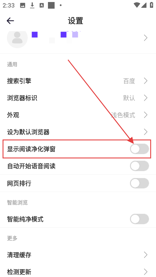2、进入设置页面后,可开启【显示阅读净化弹窗】,优化阅读体验哦。