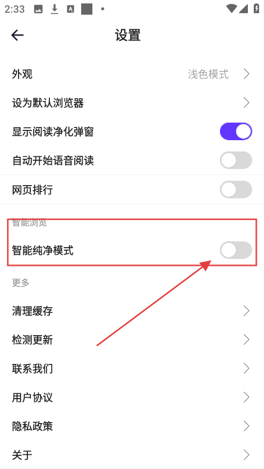 3、在设置页面,还可开启【智能纯净模式】,进一步提升阅读的纯净度啦。