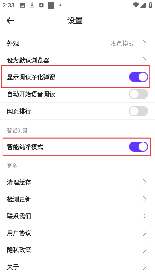 4、开启显示阅读净化弹窗和智能纯净模式后,即可享受更优质的阅读体验哦。