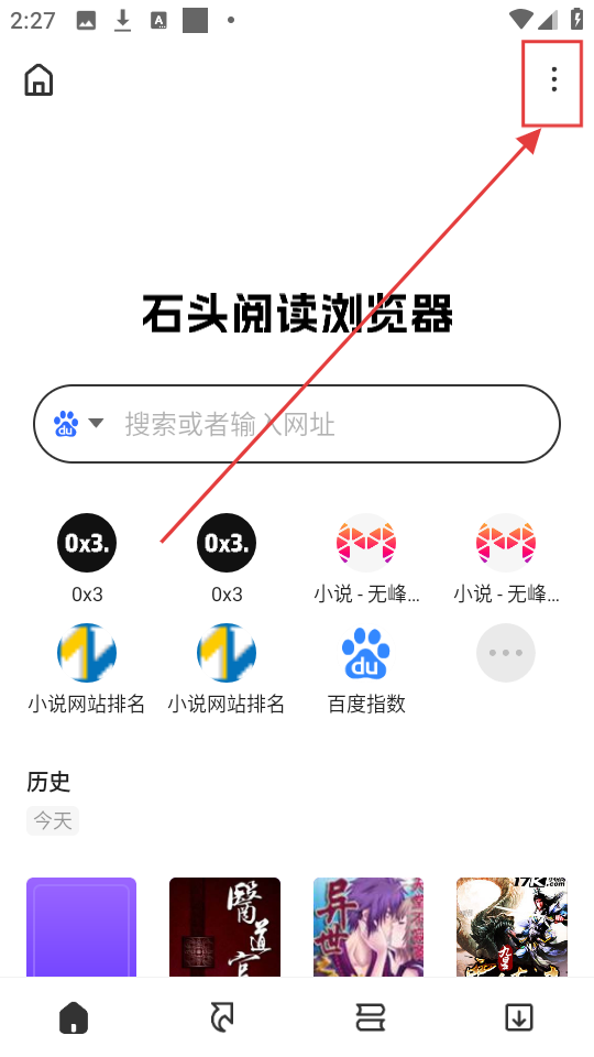 1、在石头阅读浏览器首页点击右上角三个点按钮,可展开功能菜单哦。