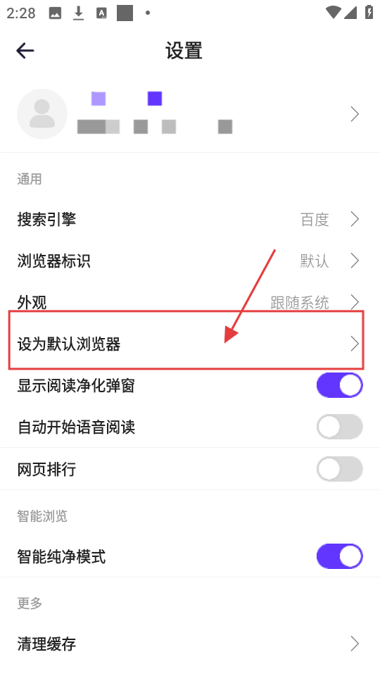 3、在设置页面点击【设为默认浏览器】选项,可进入默认浏览器设置页面哦。