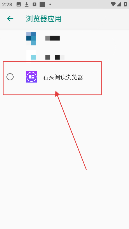 4、在默认浏览器设置页面,选择【石头阅读浏览器】即可将其设为默认浏览器啦。