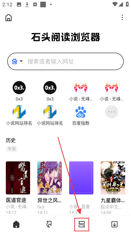 1、在石头阅读浏览器首页点击底部书架图标,进入书架页面可管理书籍哦。