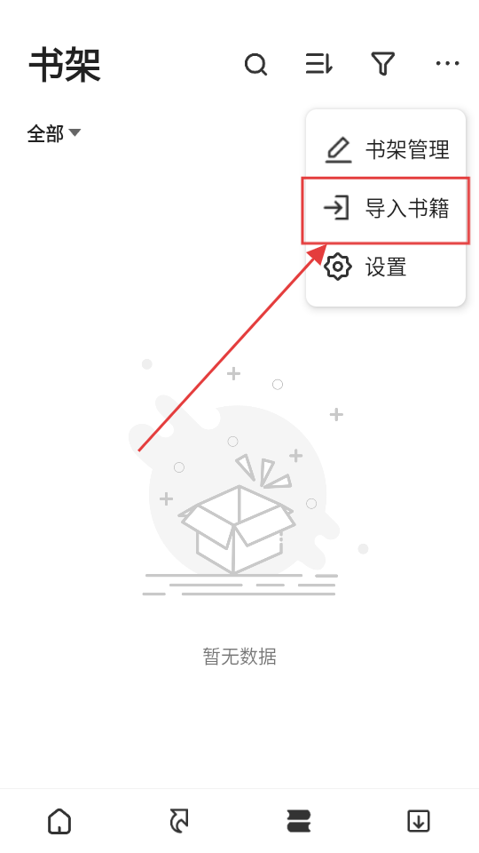 2、在书架页面点击右上角三个点按钮,可展开更多功能选项啦。