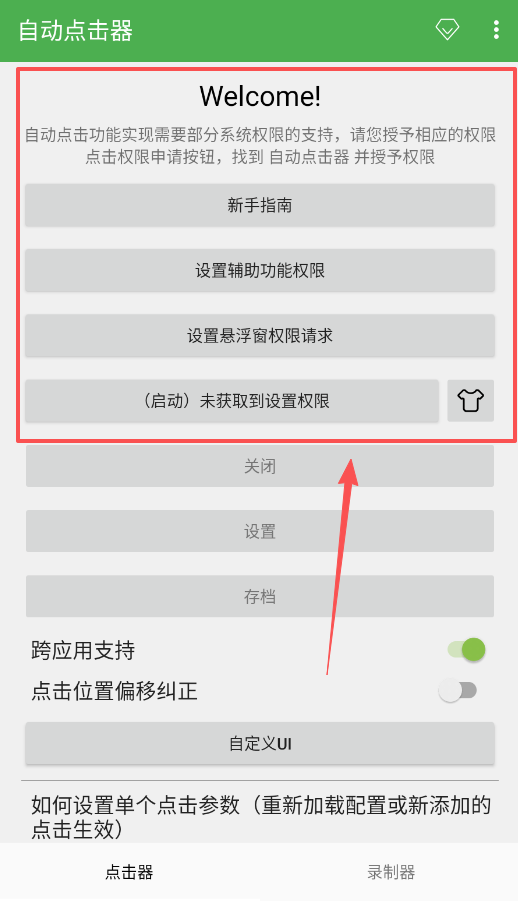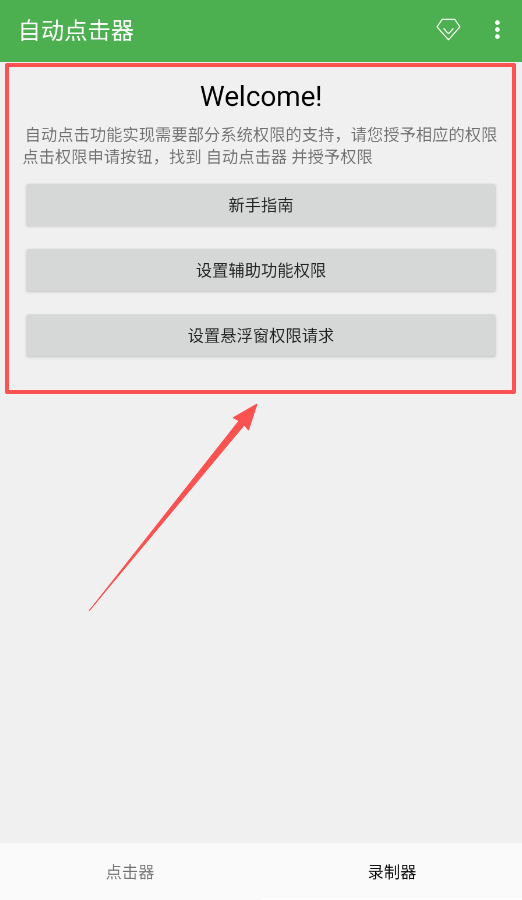 1、首要任务是点击权限申请按钮,为自动点击器开启辅助功能和悬浮窗权限,后续的自动点击和录制功能才能被顺利激活并使用。