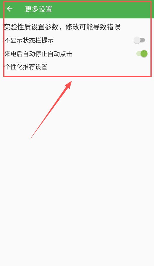 3、进入更多设置菜单,建议开启来电自动停止功能以应对突发情况,同时可以关闭状态栏提示来减少干扰,但请勿改动实验性质设置。