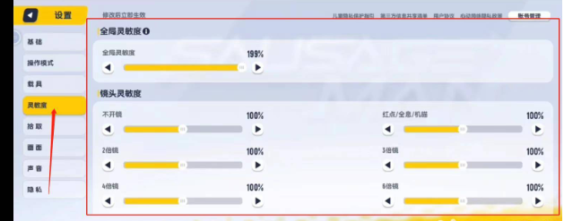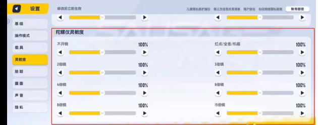 3、有全局灵敏度,镜头灵敏度和陀螺仪灵敏度,由于每个人适应的灵敏度都不相同,所以跳枪灵敏度没有固定的调整方法,需要玩家慢慢去调整到适应自己的灵敏度。