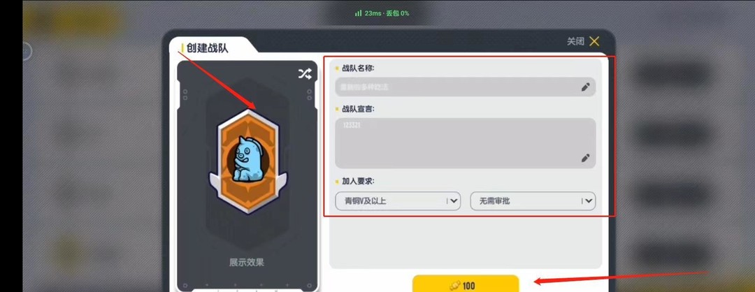 在创建战队界面选择好自己的战队图标,填好自己的战队名称,战队宣言和要人要求后点击100糖果