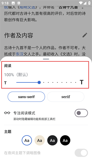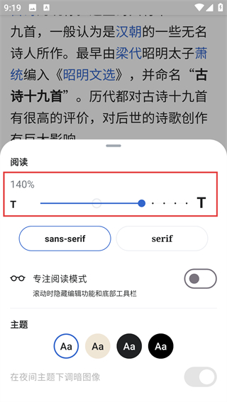 2、进入阅读设置界面后,能看到字体大小调节条、字体类型选项,还有主题切换功能哦。