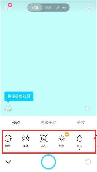 1、我在拍摄界面点击【美颜】按钮,就能打开美颜调整面板,准备给拍摄内容加美颜效果啦。