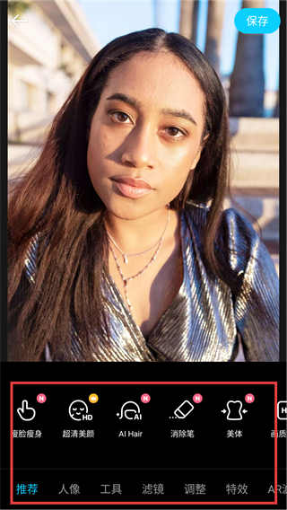4、进入修图界面后,能看到【瘦脸瘦身】【超清美颜】等工具,用这些功能就能精细美化照片啦。