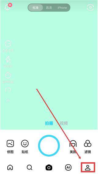 1、在拍摄界面点底部【个人】按钮,就能进入个人中心页面,查看账号相关功能啦。