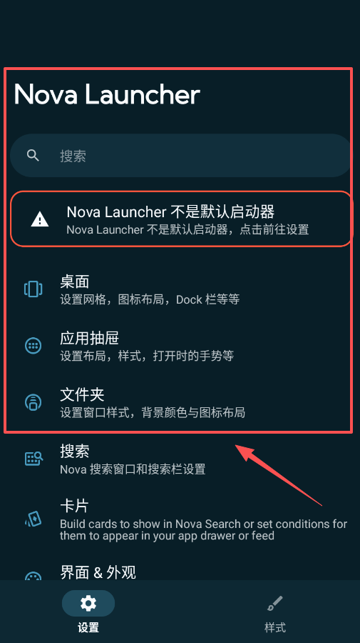 1、处理默认启动器提示,看到屏幕上“Nova Launcher 不是默认启动器”的提醒别忽略,点击它并按照系统提示完成设置。