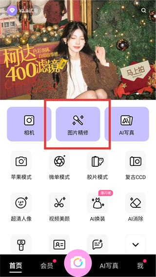 1、在首页点击【图片精修】按钮,就能进入素材选择界面,挑选要编辑的图片开始美化啦。