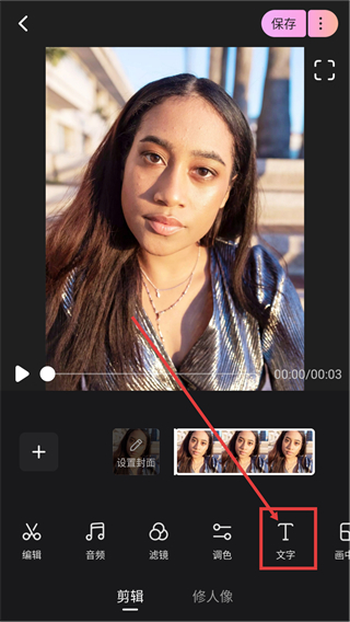 2、选好图片进入编辑页后,点击底部【文字】按钮,就能打开文字编辑的功能面板哦。