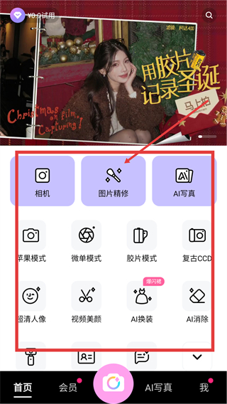 1、在首页点【图片精修】选项,就能进入素材选择界面,准备挑选要编辑的内容啦。