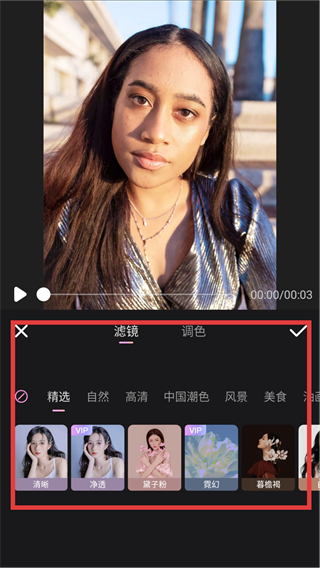 4、点【滤镜】选项后,能看到【清晰】【净透】等滤镜效果,选喜欢的就能美化内容啦。
