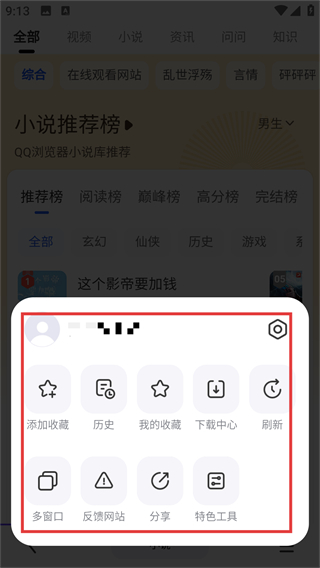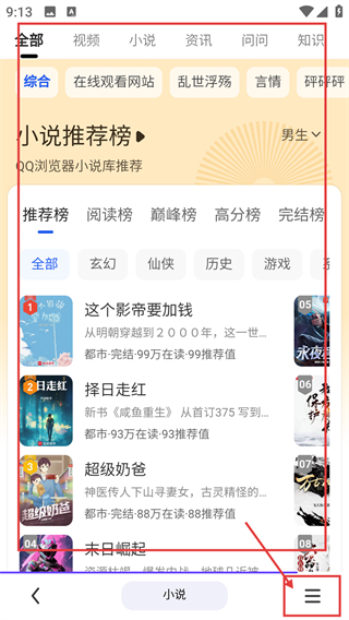 3、在小说推荐页点右下角菜单按钮,能打开功能菜单,后续可使用收藏、下载等功能啦。