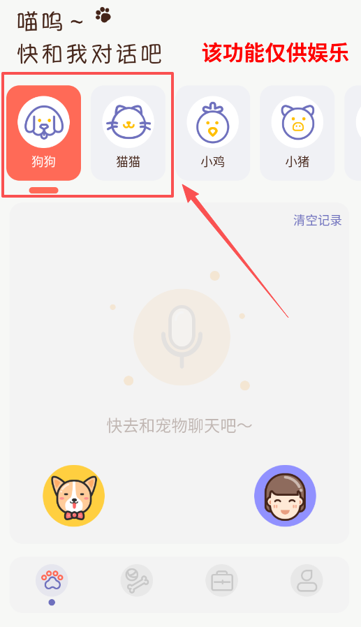 1、多种动物语言翻译:宠物对话翻译器支持多种宠物的语言翻译,包括猫、狗、鸟类等,用户可以选择对应的宠物类型,进行准确的语言翻译。