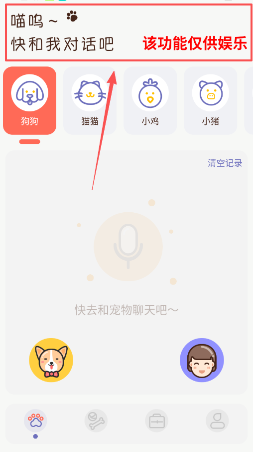4、语音识别:宠物对话翻译器支持语音识别功能,你可以直接对着手机说话,软件会将你的语音转化为文字,然后进行翻译,用户可以通过语音输入宠物的语言,并通过语音输出翻译结果。