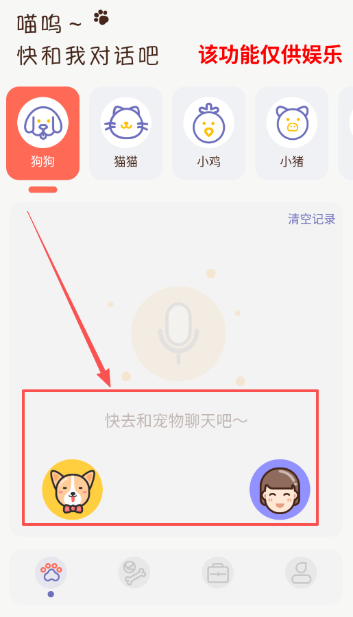 一、首先,你可以和宠物聊天。在首页的对话框里输入你想说的话,就能收到虚拟宠物的文字回复。
