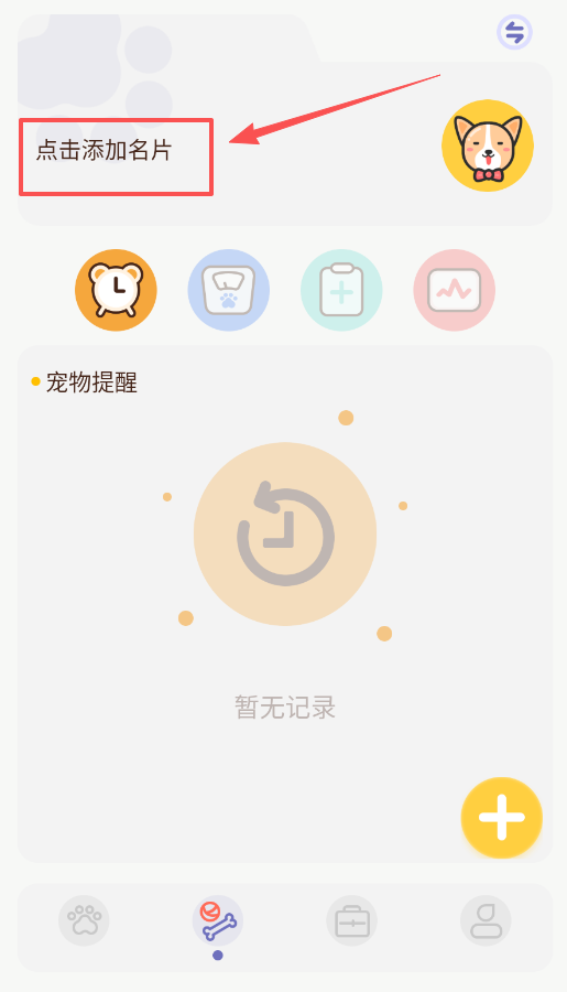 二、管理名片与设置提醒。在主界面可以点击添加宠物名片,用来记录爱宠信息。
