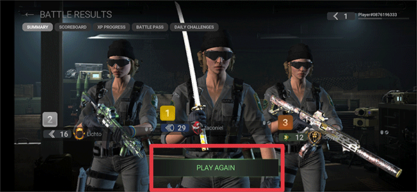 5、最后游戏结束后你还可以查看自己的战绩,若还想和队友再玩一局可以点击play again;