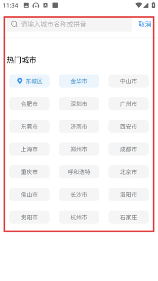 3、在城市选择页的热门城市列表里,点击目标城市如【中山市】,就能将其添加到城市列表啦。