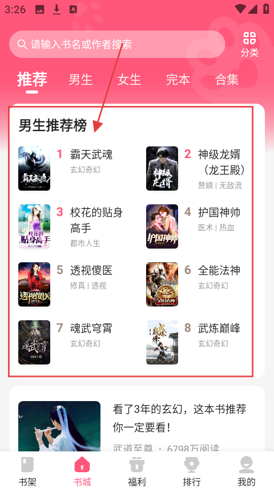 1、在书城推荐板块的男生推荐榜里,有不少热门小说,点击感兴趣的小说如【霸天武魂】,就能进入详情页开启阅读之旅啦。