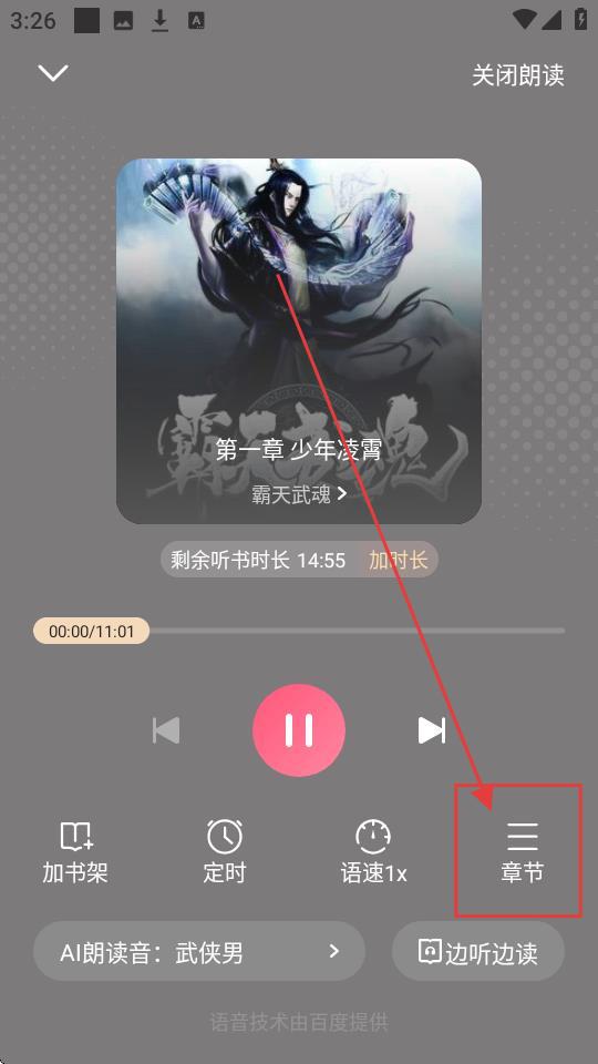 3、开启听书后,在听书界面有【章节】按钮,点击它可查看小说章节列表,方便跳转章节啦。