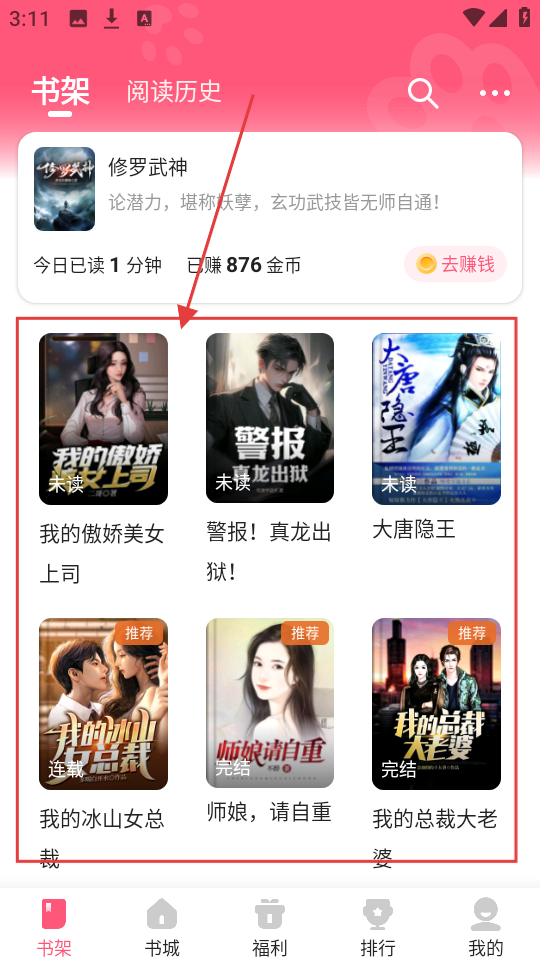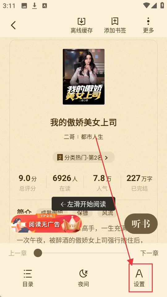 1、打开APP的书架页面,选择目标小说,比如【我的傲娇美女上司】,点击进入阅读页面啦。