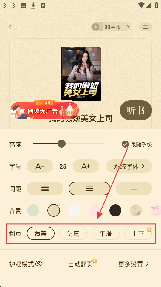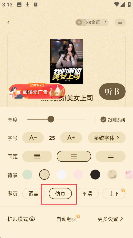 4、选择【仿真】翻页模式,即可切换为仿真翻页效果,优化小说阅读体验啦。