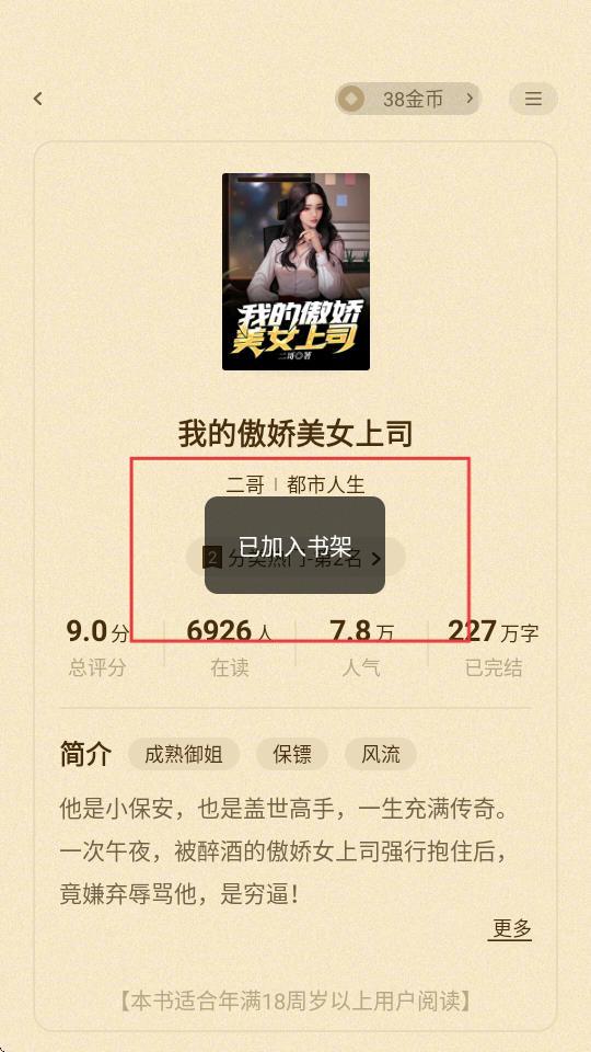 2、进入小说详情页后,点击【加入书架】按钮,就能把小说收藏到书架啦。