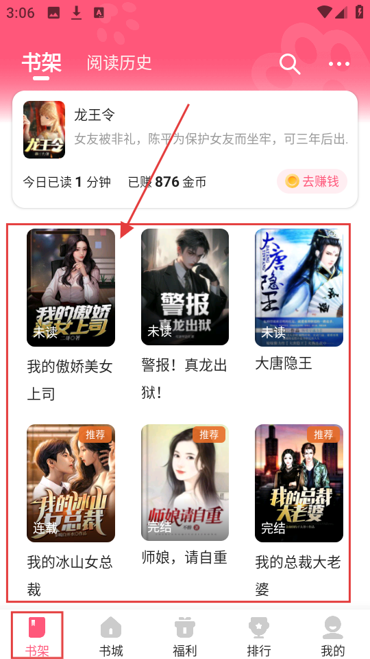 4、想查看书架上的小说,就点击【书架】,在里面就能找到【我的傲娇美女上司】啦。