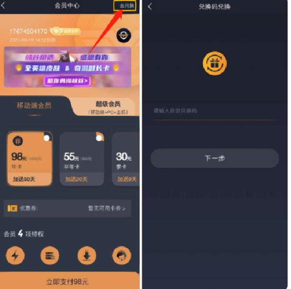 接着点击会员中心,点击去兑换在输入兑换码之后就可以进行兑换了。