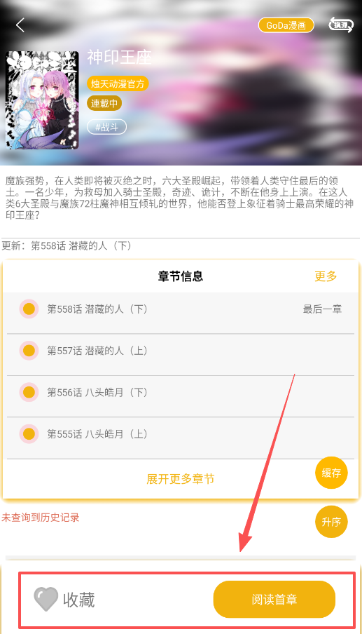 2、进入漫画详情页后,例如“神印王座”,可以先看看简介了解故事。